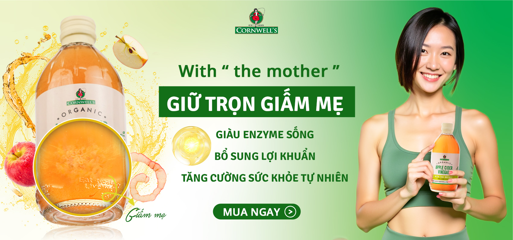 Giấm táo hữu cơ cao cấp Cornwell’s được mệnh danh là “siêu phẩm sức khỏe” nhờ hàng loạt công dụng đã được khoa học chứng minh và người tiêu dùng toàn cầu tin tưởng. Sản phẩm giữ nguyên “giấm mẹ” quý giá – nguồn enzyme, lợi khuẩn và axit amin tự nhiên giúp hỗ trợ tiêu hóa, giảm cân, làm đẹp và thanh lọc cơ thể.